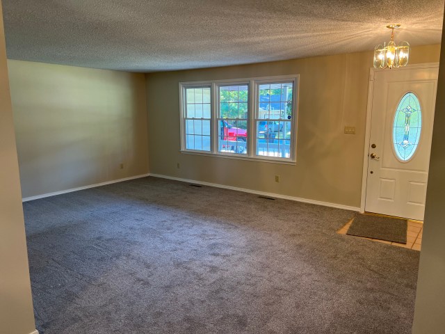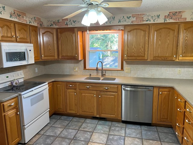 We have a beautiful one story home featuring 3 comfortably sized bedrooms, two full bathrooms, and 2 inviting living areas. The living room, family room and 3 bedrooms are accented with carpet floors throughout. The kitchen is fully equipped with an electric stove, microwave and dishwasher, perfect for everyday meals and entertaining. The formal dining room could double as an office space. A huge covered patio in the back overlooks 2 cute out buildings. A central vacuum system and an attached two car garage with a heater and overhead fan completes the home.